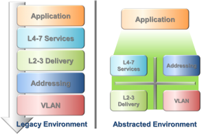 My problem started as I went from the Application Development phase to Test/QA phase. I had to run from pillar to post coordinating my application deployment needs with security, network and database/storage admins to identify the best rollout strategy. There was no collaboration between Dev and Ops teams. The alpha and beta test phases required testing on multiple subnets, across geographies, via multiple protocols like to establish proper SLA/functioning of the application. If my application had to open say, a firewall port to allow a particular traffic type (non http) it was next to impossible to get security ops to agree. Opening non-http ports were considered a security risk. In addition, tight coupling of network constructs like subnets, VLAN, security, network services, IP addresses etc with one another, further impacted the network flexibility and application deployment process. (Refer to Figure-1 below for details)