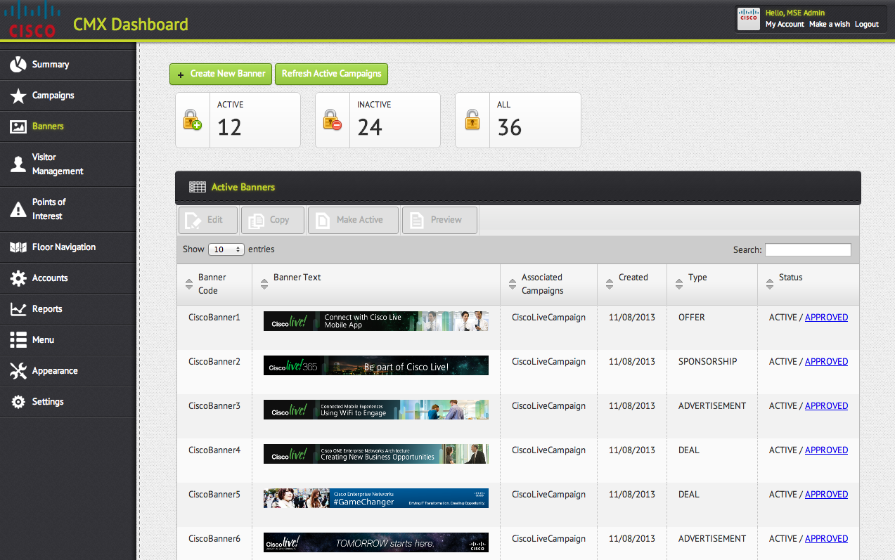 Browser Engage comes with a simple user interface, called CMX Dashboard. Sales or marketing representatives from organizations can login to this dashboard to setup the content for pushing out to mobile end users in the premises. Organizations have the option to serve up -two types of content: services and banners. The organization also has the ability to create "Campaigns" that contain the parameters for the execution plan for which banners and services to display based on time, date, location and many more parameters. You don't want to see a coupon for a glass of wine at 10:00am, right? That's exactly the kind of flexibility that is built-in to Browser Engage.