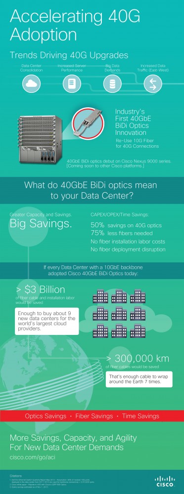 As customers migrate to 10/40G over the next few years, the cost of laying new fiber and overhauling the optics is a tremendous drag and raises barriers for 40G adoption. I wrote about multi-layered innovations -this is one of them at a component level. The 40G BiDi lets customers preserve their existing 10G cables, resulting in tremendous time savings, cost savings (labor and fiber) as well as improved time to market for the upgrade. Bandwidth upgrades is one of the top reasons that drive network refreshes, and this innovation (a Cisco exclusive) produces remarkable results