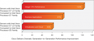 It is interesting to note that although all vendors have access to same Intel processors, only Cisco UCS unleashes their power to deliver high performance to applications through the power of unification. The unique, fabric-centric architecture of Cisco UCS integrates the Intel Xeon processors into a system with a better balance of resources that brings processor power to life. Cisco's results demonstrate the degree to which Cisco servers deliver the power of the new Intel Xeon processor E7 v2 family. Cisco UCS maximizes Intel innovations and as a result Cisco UCS with the Intel Xeon processor E7 v2 family delivered up to 122 percent better performance over the prior generation of Intel Xeon processors, as shown in the graph below: