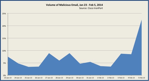 At 36%, phishing scams employing malicious attachments also factored significantly over the past two weeks, mainly due to an outbreak beginning Feb 4th. This increase was significant enough to affect overall volume of malicious email, as seen in the chart below.