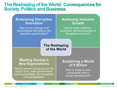 Profound political, economic, social and, above all, technological forces are transforming our lives, communities and institutions. New global social communication channels are shifting the way decisions are being made from a hierarchical approach to a networked approach, with more access regardless of age, gender, and location. Given these large scale global changes, how do world leaders develop the insights, initiatives, and actions necessary to respond to current and emerging challenges?