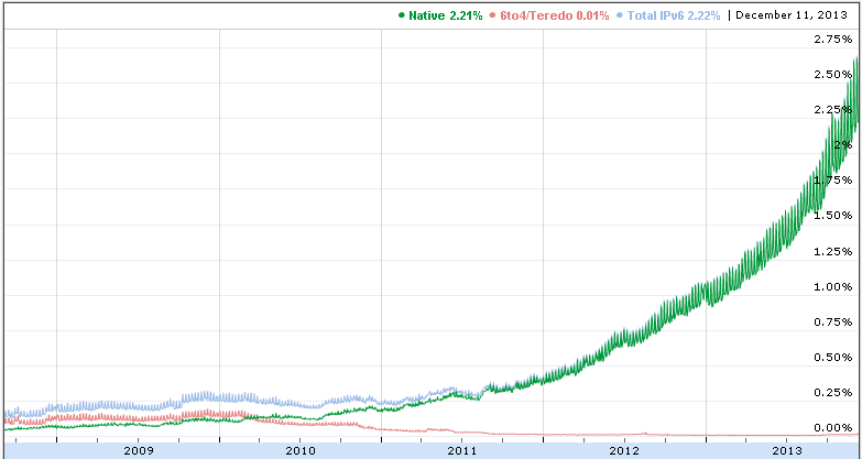 These are all hard trends. To make a few examples, Google is actually counting how many search requests it gets from IPv6 enabled browsers (that means v6 on devices and internet connectivity). Look what a trend we have, well over 2% of search queries worldwide are over IPv6: