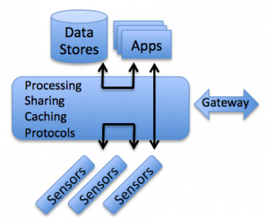 Such a fabric should be deployable on servers and other devices like for example routers and switches (potentially building on top of a Fog infrastructure). The fabric should be distributed and scalable: adding new nodes should re-balance the fabric. The fabric can span multiple storage media (in-memory, flash, SSD, HDD, ...). Storage is transparent to the application (developer), and applications should be able to determine (as a policy) what level of storage they require for certain data. Policies are a fundamental aspect of the data fabric. Some other examples of policies are: (1) time (length) data should remain in the fabric, (2) what type of applications can access particular data in the fabric (security), (3) data locality, the fabric is distributed, but sometimes we know in advance that data produced by one application will be consumed by another that is relative close to the producer.