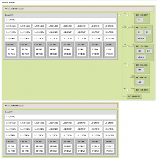 Figure 2 shows the system topology of a single server of Mellanox's R&D system, "Sputnik", which consists of two Sandy-Bridge NUMA servers. Each NUMA node has eight physical cores with two hyperthreads per core. We are able to clearly see that this system has a single Mellanox Connect-IB HCA, mlx5_0, attached to socket P#0. Launching an MPI application with the following command: