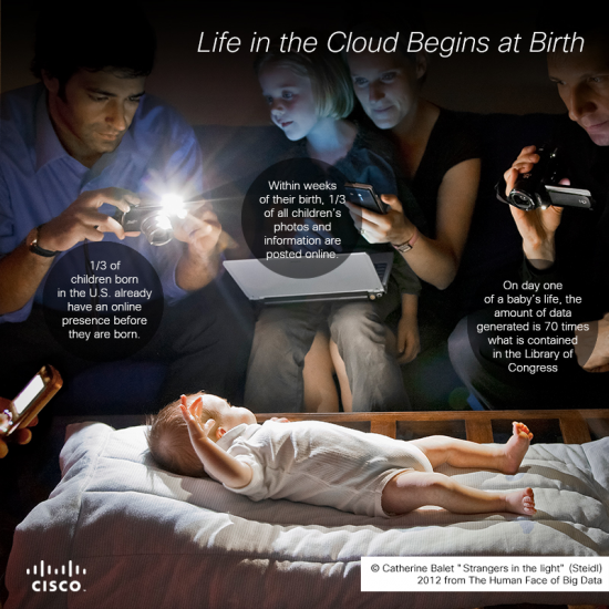 In photojournalist Rick Smolan's Human Face of Big Data project, stunning facts about how big data and the world of many clouds are changing how we live our lives, from our very first day, are showcased. For example: