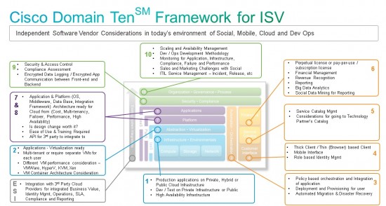 As highlighted in my previous blog on Cisco Domain Ten Framework for IT Transformation , businesses can use Cisco Domain Ten Framework to discuss all ISV considerations for running their SaaS business. This framework is designed to help businesses of all sizes succeed in today's changing market, and provides an avenue of support for almost any situation.