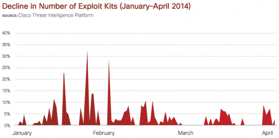 While there's more competition in the exploit kit market, it's not translating to a greater number of deployed kits, as Cisco research shows. In fact, the total number of active exploit kits has dropped dramatically-by 87 percent-since Paunch's arrest.