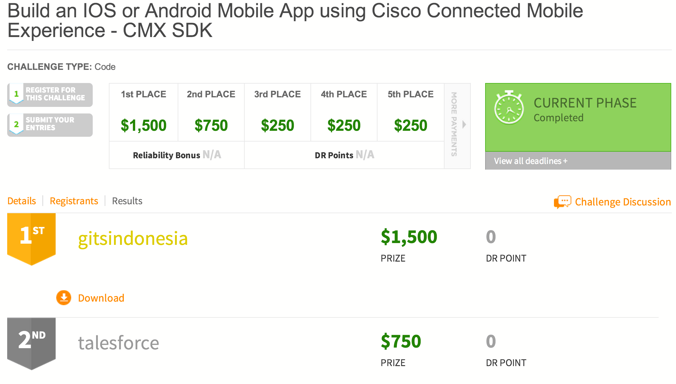 Both submissions are in review for incorporation into future Cisco CMX offerings. Join us in our current or future developer challenges at http://cisco.topcoder.com. Thank you for participating!