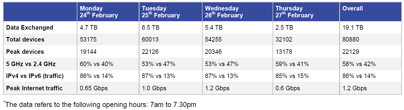 It was about 1PM local time on Tuesday 25th February, the second day of the show, when we struck the peak of 22126 simultaneously connected WiFi devices on the network. There were high five celebrations across the entire network operations team center. Everyone was thrilled; applauding at this never before seen figure for such an event.