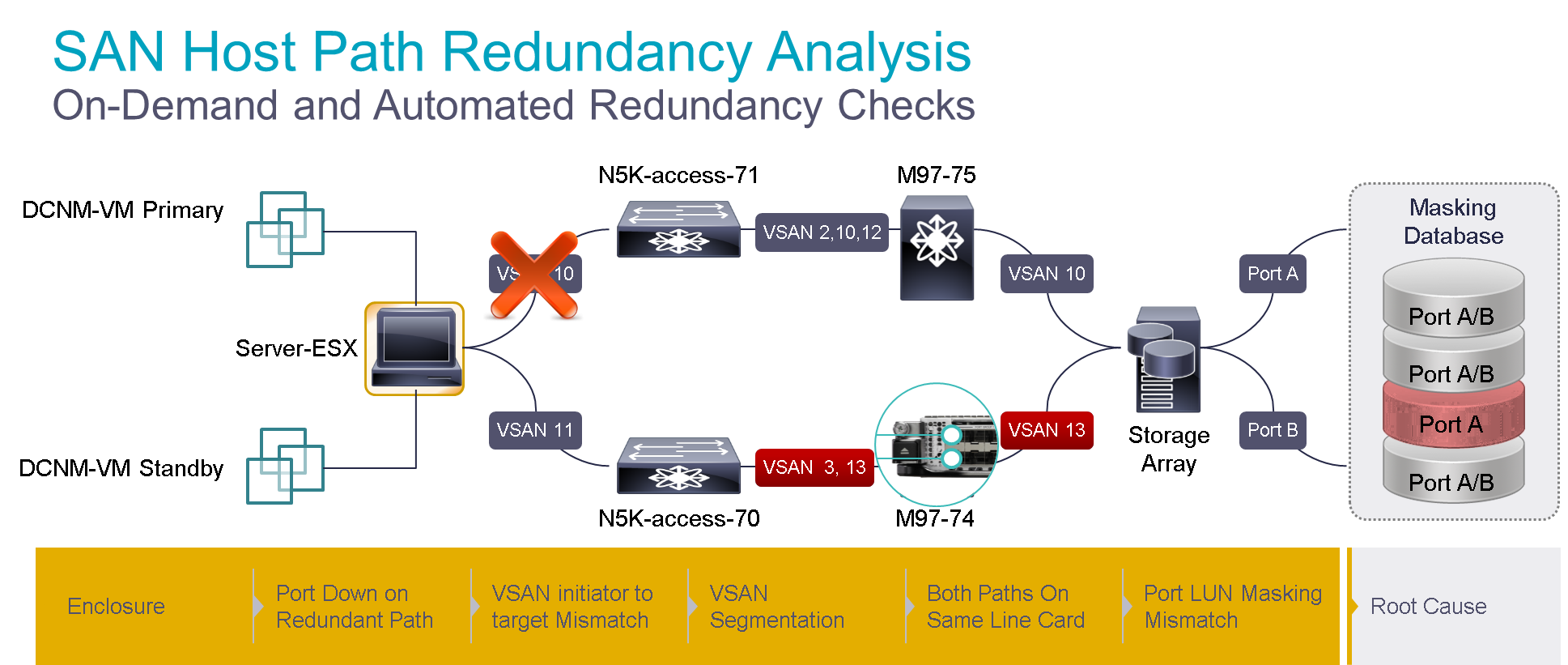 Host Path Redundancy Analysis checks the network every 24 hours or customer designated interval if there is end to end dual paths from Host to the target. It checks against port down situations, VSAN mismatches, VSAN Segmentation, LUN mismatches as well as makes sure both the ports are not on the same line cards. Similar activity that used to take months is now completed on the fly every 24 hours reducing risk and time to repair. Further more administrators are not surprised by an outage as they have complete visibility for the dual paths. Furthermore having both the paths up allows to mitigate any silent failures as well as avoid outages if one of the SAN fails.