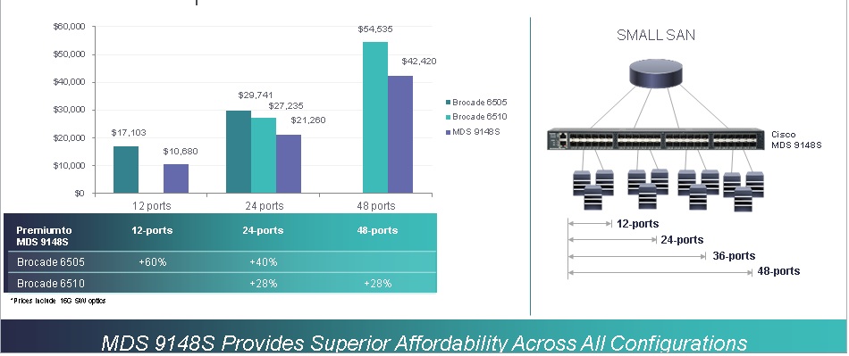 How is MDS 9148S more affordable? If we compare 12-port configuration against competitive products, MDS 9148S is about 60% less expensive and when compared against 48 port configuration MDS 9148S is about 28% less expensive -see chart below for cost savings based on different configurations. As you can see, MDS 9148S provides superior cost savings across all configurations, and by the way, the cost also includes enterprise class features like (VSAN, Port Channeling etc) -with no additional cost for these capabilities. ( Note : Price is based on the list price available on the net. Prices include 16G SW optics.)