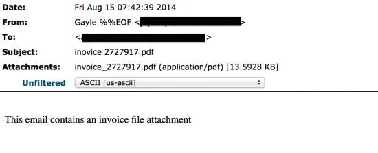 Despite the large number of IP addresses used in this spam campaign, the messages themselves appear suspicious due to the spam-like characteristics in the headers and body of the message. Message in this spam campaign have a subject like "inovice 2921411.pdf" where the number in message subject is randomly generated and the word "inovice" is misspelled. The From header in the message varies, but typically contains unusual character strings such as "EOF", "endobj", and "endstream". These messages have little to no content inside the message body itself, but instead have a PDF attachment that the message body refers to in order to entice the user to download and open the attachment. An example of one of the messages we observed follows.
