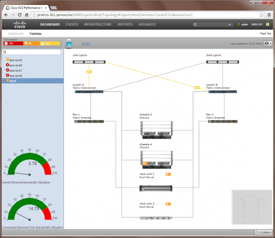 Based on technology from Zenoss, this Cisco solution delivers granular device monitoring from a single customizable console. Cisco UCS Performance Manager uses Cisco UCS APIs and other native APIs and interfaces to collect data from UCS Manager and integrated infrastructure end points to display comprehensive information about all UCS infrastructure components.