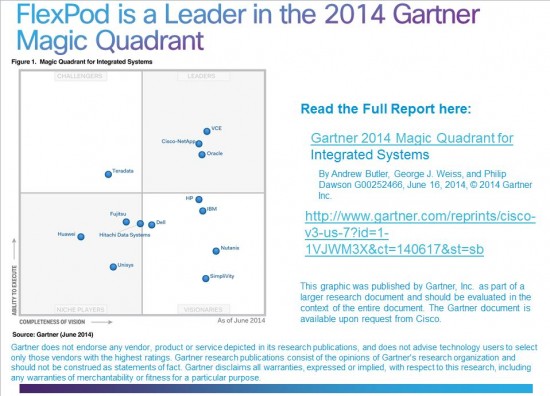 The month of June was very exciting for FlexPod. On June 16th, Gartner released their 2014 Magic Quadrant for integrated infrastructure with FlexPod positioned in the leaders quadrant. On June 25th, Cisco and NetApp