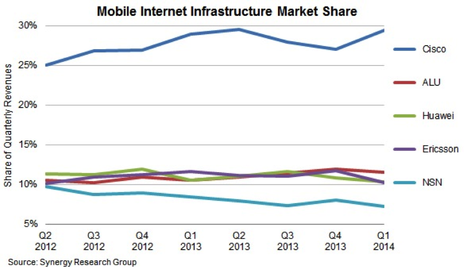 "Cisco's position is thanks mainly to its strength in switching and routing for mobile IP networks, though it has a strong presence in several other segments too" said John Dinsdale, a Chief Analyst and Research Director at Synergy Research Group. "With fixed and mobile broadband subscribers breaking the three billion mark and set to reach five billion well within the next four years, this is a good market in which to be strongly positioned."