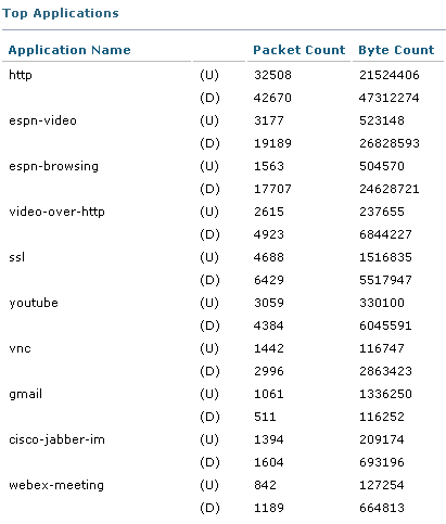From this view in Prime Infrastructure, you can see the regular common apps Cisco employees are using over the web-WebEx Meeting and Cisco Jabber IM. We pulled this image during a match and clearly you can see that a significant number of employees were streaming on ESPN video and ESPN browsing.