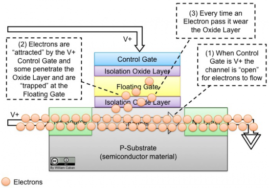To "write" into a "NAND Flash Cell" the control gate is positively charge "opening" the channel at the P-Substrate (semiconductor material) allowing the flow of electrons from the source to the drain. Electrons are attracted by the positively charged control gate and through a mechanical phenomenon known as quantum tunneling {http://en.wikipedia.org/wiki/Quantum_tunneling}, some electrons will jump through the oxide layer and get trapped in the floating gate.