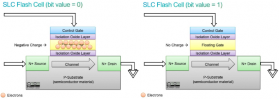 As seen in the previous table, a single-level cell (SLC) stores a single bit in the floating gate. If there are no charges in the floating gate, we say we have a bit value of one (1), if the floating gate has a negative charge, we say we have a bit value of zero (0).