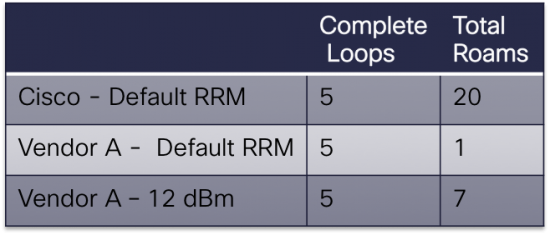 With Cisco, the roams were both consistent and predicable as the train went around the track. Vendor A was a different story. Vendor A's radio resource management had assigned all four APs to maximum transmit power, so the client associated to the middle AP and never roamed. To help facilitate the roaming with Vendor A, we lowered the maximum transmit power in RRM to 12 dBm. In this case the client roamed, but the roams were not nearly as consistent nor as predictable as with Cisco.