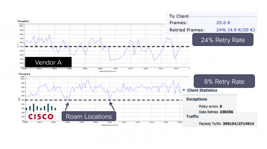 This screenshot shows the implications on client performance of Vendor A with default RRM vs. Cisco. Cisco maintained consistent throughput with a low retry rate. With Vendor A, the client stuck to one AP, so the throughput is inconsistent, but more importantly there is a high retry rate, which would wreak havoc on real-time applications such as voice or video calls.