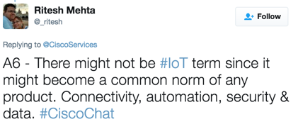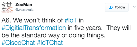 The Internet of Everything (IoE) has already started to transform the world-and it is the next big wave of growth in the telecom industry. We had an opportunity to participate in the IoE conversation and show how service providers are uniquely positioned to enable the journey to the IoE. We brought CRS, ASR 9000, nV satellites, and the ASR 901 cell site router to the IoE booth on the show floor, to illustrate how service providers can efficiently deploy and manage mobile devices. We were able to explain how automating the creation of new services is critical for keeping up with the pace of the IoE.