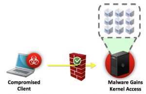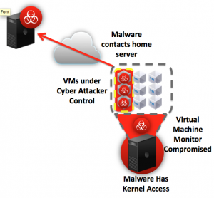 As a result, the cyber attacker has direct access to the data center and will begin to attempt to compromise the servers and applications in the data center. Most enterprises will have hardened their perimeter, but may have little to no visibility of the threats that are inside of their perimeter defenses. This leaves the servers vulnerable to exploits such as virtual machine-based rootkits (VMBR). Successful VMBR exploits such as Blue Pill by Joanna Rutkowska, have been demonstrated way back in August of 2006 at Black Hat by researchers.