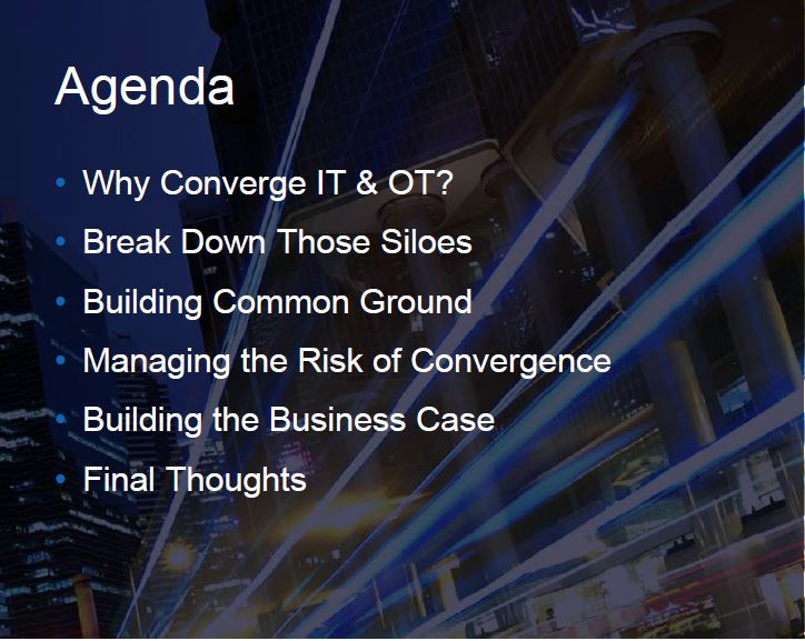 Many of you know of Rick Geiger from this blog and other publications. Rick's session at Cisco Live 2014 discussed the many aspects and challenges of merging OT and IT in organizations. Computing and networking for operations requires more IT-based support and a growing convergence of IT and OT skill sets to support intelligent devices and varied processes. Rick's session discussed the convergence driven by the critical needs of the OT organization for the process maturity of IT and for managing and securing the growing complexity of OT systems.