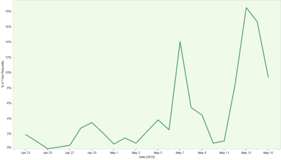 Unfortunately, we observe extensive global DNS requests for the Angler landing pages, indicating that this campaign is largely succeeding even if only 10% of victims (a reasonable exploit kit percentage) are exploited due to failure to upgrade their system's applications.