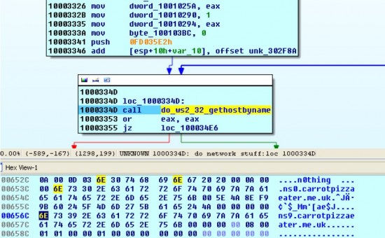 The embedded Silverlight exploit uses a custom IntPtr handle above (which gets called in agcore.dll) to achieve code execution. The dropped malware starts listening on ports 14099 and 20231, decrypts "C:\Documents and Settings\<user>\Local\Settings\Application Data\extrics.dll" and then calls loadlibrary on it. Extrics.dll uses ws2_32.dll (Winsock) to establish a TCP session with the hard coded address, ns9.carrotpizzaeater.me.uk.