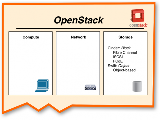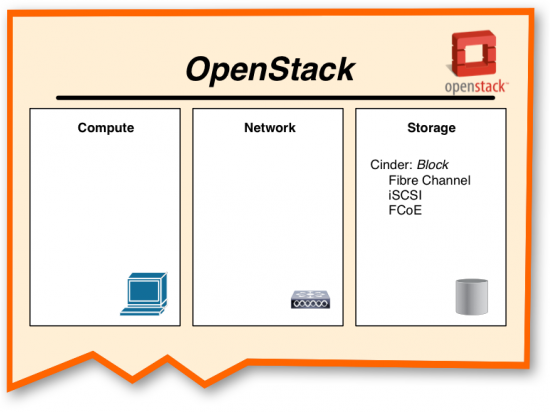 "Glad you asked," he said, smiling. "It makes sense that you would probably hear about Cinder first, as it's the part of OpenStack that deals with iSCSI, Fibre Channel, and also Fibre Channel over Ethernet."