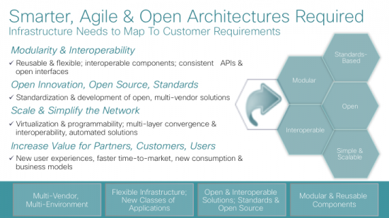 "Exactly," Jim said, smiling. "This is a fundamental shift in the customer-vendor relationship. And Cisco is working on all kinds of those tools for customers to use. Cisco's architectures are shifting to become more open, interoperable and flexible. They're also providing lots of choices in tools for people that may need a different tool for the language or code they are working on or have expertise in. The Nexus platform, in particular, has all kinds of tools. Python, Puppet, Chef, OpenFlow, onePK..."