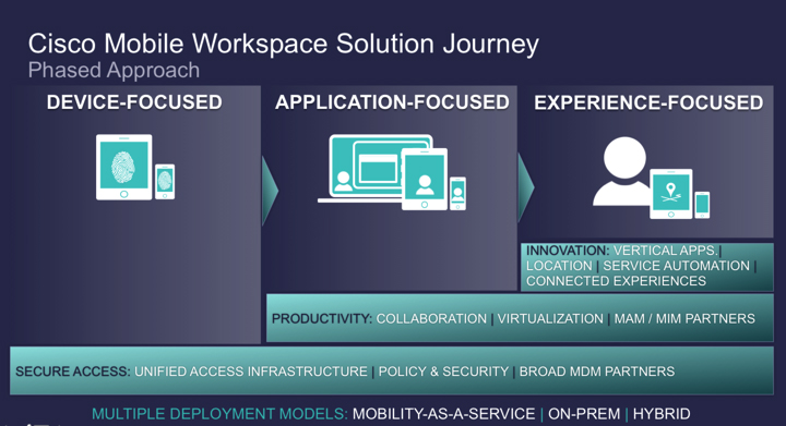 As Jonathan describes in the blog post linked above, organizations typically begin from a device-focused approach. IT often focuses on corporate-liable devices or employee owned devices, providing an easy way to onboard these devices and access basic services. Then, organizations progress to the application-focused phase, where the enterprise leverages mobile applications to provide productivity and empower employees.