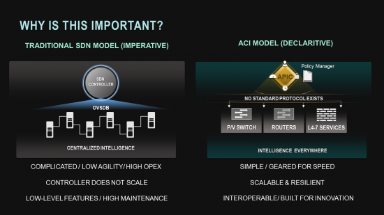 If we contrast that with the vision of the ACI model with the Application Policy Infrastructure Controller (APIC), ACI adopts a declarative management approach. This model abstracts applications, operations and infrastructure providing simplification and agility. By distributing complexity to the edges, it also increases better scalability, and allows for resiliency -i.e. the data forwarding can still continue to happen even if there is no controller. It further provides ease of use with self-documenting policies automatically deployed or cleaned up from devices as necessary. All of these help circumvent the issues seen in traditional SDN models.