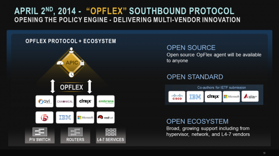 Continuing on its tradition of contributing and committing to open source and open standards over the last 25 years, today Cisco announced "OpFlex" -a new open standards-based protocol for Application Centric Infrastructure that has been submitted into the IETF standardization process. We believe this will accelerate multi-vendor innovation in data center and cloud networks to drive operational simplicity, lower costs and increased agility.