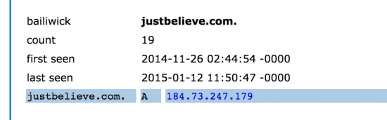 When Talos studied further the list of domains hosted on that particular Amazon EC2 IP, some of the domains that were not associated with the redirection network caught our eye. For example, the domain "justbelieve.com" was being hosted on the 184.73.247.179 IP at the very same time as our malicious redirectors.