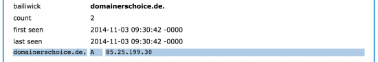 The typosquat domains are hosted in a variety of different places, but they tend to cluster together on particular IP addresses, probably as a result of being owned by the same registrant. When Talos checked passive DNS to investigate what other domains were being hosted on the same IP address as typosquat domains such as hulu.cm, geico.cm, wellsfargo.cm, and others, we found something interesting. The domain domainerschoice.de is still currently being hosted at that exact same IP address, 85.25.199.30. The domainerschoice.de domain redirects web visitors to www.domainerschoice.com, A.K.A. the domain registrar "Nanjing Imperiosus Technology Co. Ltd".
