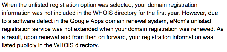 In mid-2013, a problem occurred that slowly began unmasking the hidden registration information for owners' domains that had opted into WHOIS privacy protection. These domains all appear to be registered via Google App [1], using eNom as a registrar. At the time of writing this blog, there are 305,925 domains registered via Google's partnership with eNom. 282,867 domains, or roughly 94% appear have been affected [2]. (Google reports that new domains which have not faced a renewal period are not affected and many businesses do not opt into their privacy service.) The information disclosed included full names, addresses, phone numbers, and email addresses for each domain. The information was leaked in the form of WHOIS records.