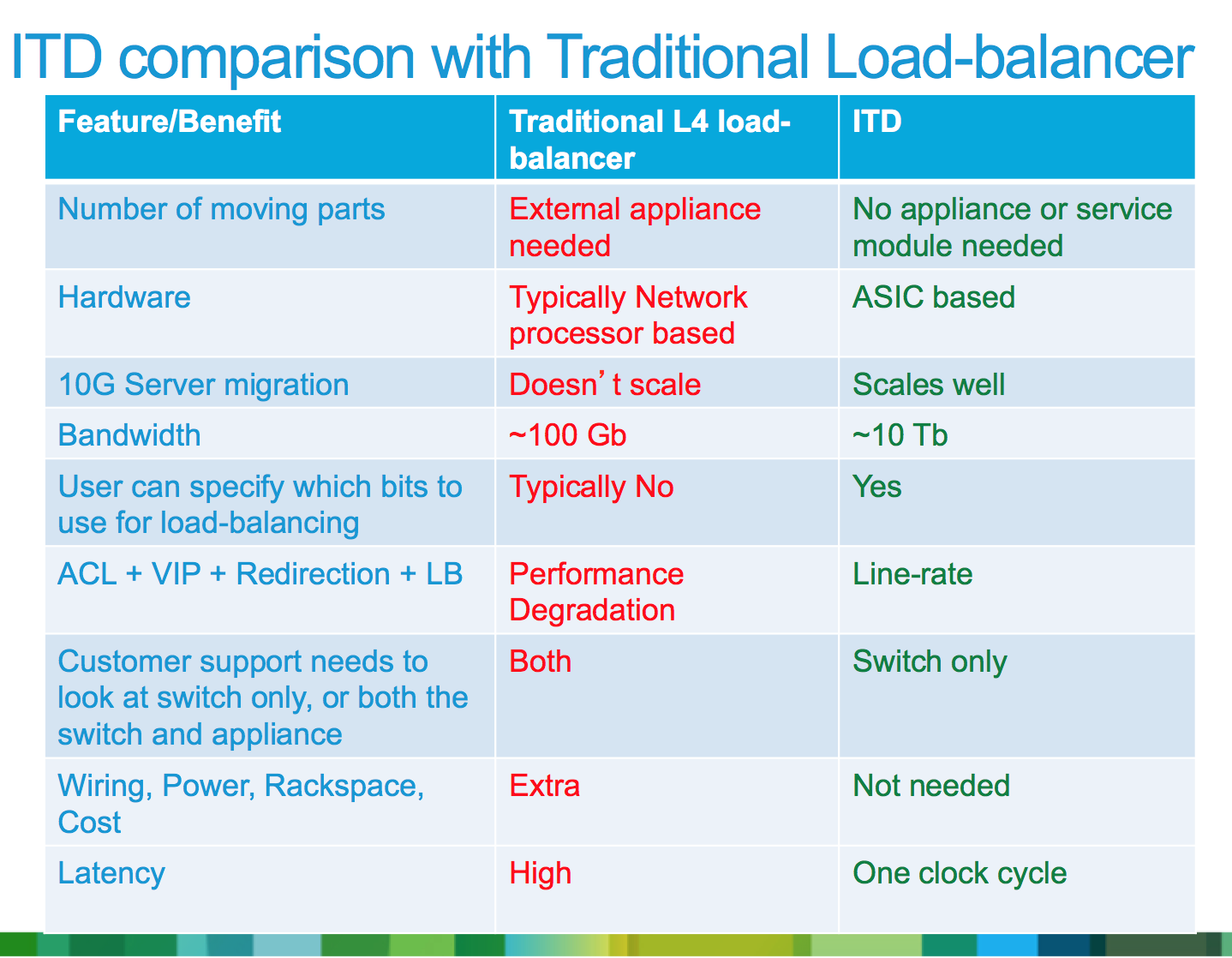 ITD provides order of magnitude CAPEX and OPEX savings for the customers. ITD is available on Nexus 7000/7700 series in NX-OS 6.2(10) or later. It is available for demo/EFT on Nexus 5k/6k/9k. ITD is much superior than legacy solutions like PBR, WCCP, ECMP, port-channel, layer-4 load-balancer appliances.