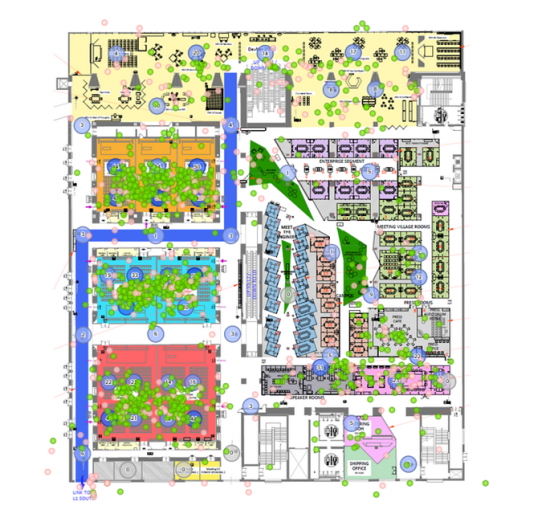 Besides charts and numbers, there are more ways to visualize where people congregate. MSE 10 can display the live locations of devices on a map. Figure 6 shows exactly this, a map dotted with location of all detected detected. At the time of this screen shot, sessions were ongoing in the orange, blue and red meeting rooms on the left-hand side, as can be seen from the large numbers of devices detected there.