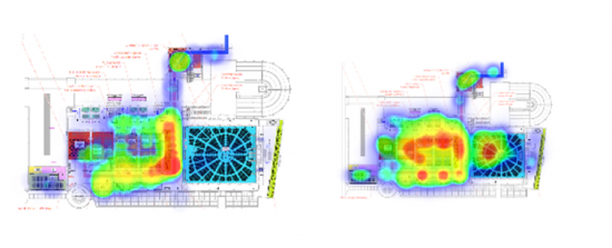 We can also show this information as a heat map. Figure 7 shows two heat maps captured on a different floor which housed conference rooms. The difference between the spread of people during and between sessions can be clearly seen.
