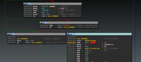 If the function fails to grab the PNG, it will sleep and try again. Once the PNG is obtained, the retrieving function performs some basic verification that it received the correct image file. The sample checks for a "200 OK" response and checks that the length is 0x41EA9 (269993). It then moves to the beginning of the embedded DLL at offset 0xEA9 (3753).