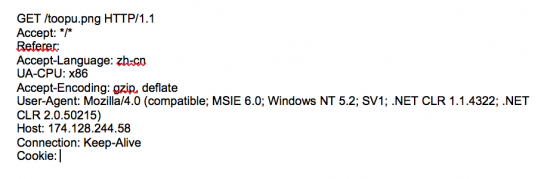 The function used to build the http request that retrieves the malicious PNG seems to be missing some functionality. It has format strings for most of the HTTP headers, but it only provides a User-Agent and Accept-Language values. The request for toopu.png has an empty referrer and cookie header.
