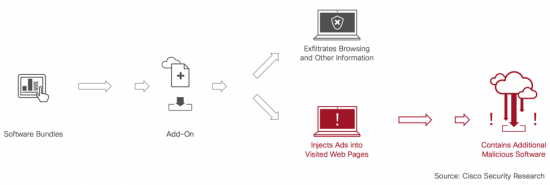 Last year, Cisco's Cognitive Threat Analytics CTA by means of automated behavioral analysis of web telemetry, uncovered a new threat, which our researchers have found to be a family of malicious browser add-ons. Once installed, they inject unwanted advertisements on certain pages that the user visits. This provides revenue to the miscreants and at the same time opens a channel to deliver further malware, track and exfiltrate end user data.