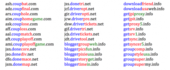 Cisco researchers compiled a list of 570 unique domains used from January through November 2014. These domains appear to be created using a domain generation algorithm (DGA) based on common dictionary words. These domains are likely registered using a domain service via application programming interface (API) tools so that they can be scripted and automatically registered. Malicious actors will often load their domain registration scripts with random words from a custom made dictionary. The resulting domains registered as a result of this scripted process often emerge as a nonsensical combination of words.