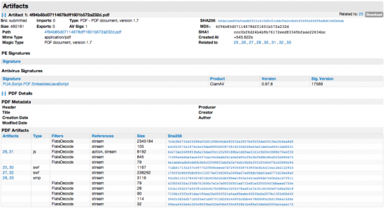 Through the AMP Threat Grid PDF Static Forensic module, PDF Object Stream contents are automatically identified and extracted. The stream contents are listed as artifacts in the form of [original filename].pdf[stream number]. The analysis engine is able to decode XFA data, as well as other payloads such as XDP, and then extract the decoded artifact. Each extracted Object is considered by AMP Threat Grid to be an Artifact and, based on the Object's Filetype identification, undergoes a level of additional analysis.