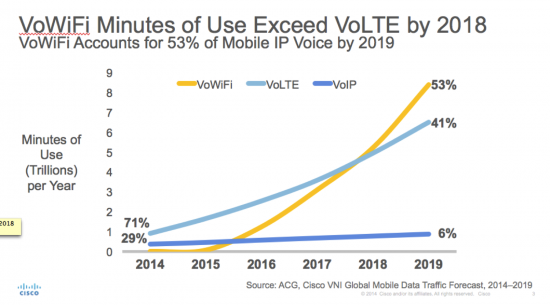 Several global mobile carriers have recently launched or announced their intent to deliver voice-over-Wi-Fi (VoWi-Fi) services. Voice over Wi-Fi is not a new concept, but earlier solutions had limitations that inhibited broad adoption and sometimes delivered a less than optimal end-user experience. Since then, VoWi-Fi enhancements now make it a carrier-grade application (more stable, reliable and secure). This service can now be offered independent of the hardware capabilities of the device as long as the device has Wi-Fi enabled on it, even non-SIM devices such as Wi-Fi-only tablets can have this service turned on. Today, VoWi-Fi can extend the reach of MNOs by enabling them to deliver a cost-effective, scalable, and quality solution for delivering in building coverage, where cellular coverage might be sketchy. This year's VNI Mobile Forecast predicts that VoWi-Fi will surpass voice over LTE (VoLTE) in terms of minutes of use by 2018. By 2019, VoWi-Fi will have 53 percent of mobile IP voice, up from less than a tenth of a percent in 2014.