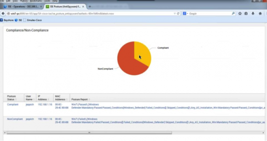 To illustrate an example of this process, let's look at the Splunk for Cisco ISE app compliance dashboard summary below. The syslog information from Cisco ISE would have been sent over to Splunk to create this dashboard showing that users are compliant, in this case, because they have the Windows Defender service installed on their devices.