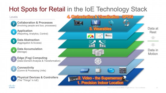 • Precision indoor location will take us from analytics at the zone level to the aisle level within stores through Cisco's new angle-of-arrival technology based Wi-Fi store-wide. Supplemented by beacons and sensor fusion for key focus areas, location aware experiences are poised for transformation.