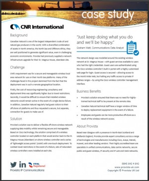 Cisco partner Provista IP Communications* provided a solution to Canadian Natural Resources that delivered a flexible off-shore wireless network supplying data mobility whilst remaining secure and manageable.
